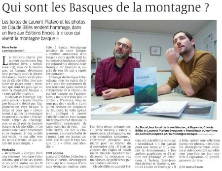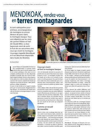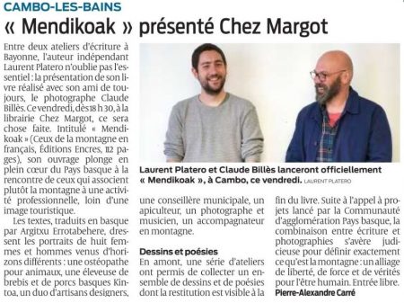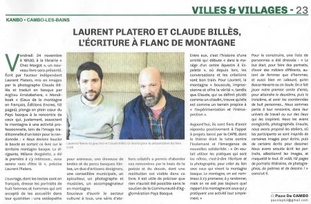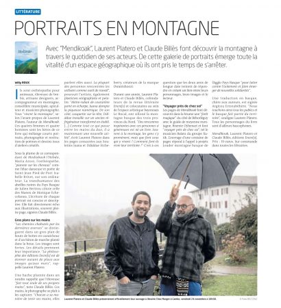 Ce livre paru le 24 novembre 2023 dresse les portraits de huit femmes et hommes qui ont accepté d’accueillir dans leur quotidien l’auteur Laurent Platero et le photographe Claude Billès : une ostéopathe pour animaux, une éleveuse de brebis et de porcs basques Kintoa, un duo d’artisans designers, une conseillère municipale, un apiculteur, un photographe et musicien, un accompagnateur en montagne. Présentés par les mots et les images, dans une approche littéraire et artistique, celles et ceux de la montagne parlent de leur territoire et des lieux qui les inspirent.